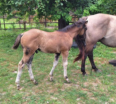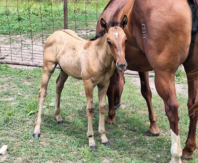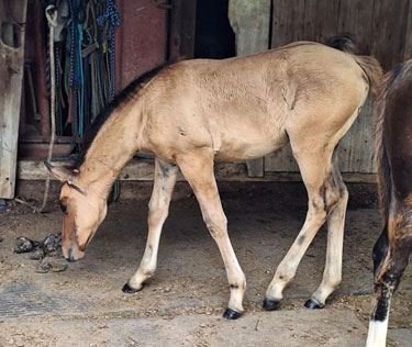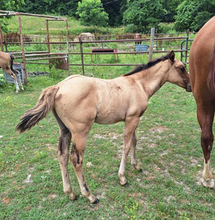 Cameo is a dun filly with black points born in May 2025. She is cute and sassy and likes attention on her terms. Cami has the quickest feet of our foals this year, not for an inexperienced handler. She is fairly reactive and can turn herself around in a flash. She should mature a little under 15 hands tall and have an athletic build. Her sire goes back to Bob Acre Doc and Hollywood Jac 86 for an athletic cross of old time cutting and reining lines. Her dam is a solid ranch type mare that has Genuine Doc (sire of Shining Spark and others), Zan Parr Express, Gallo Del Cielo (Rooster), and Zan Parr Chief on her papers. SOLD!