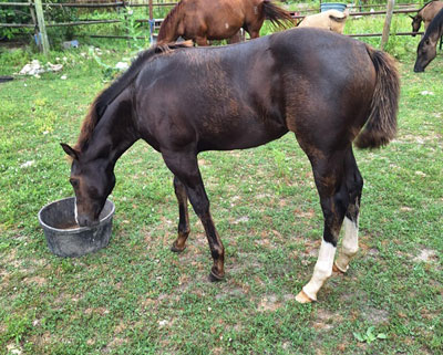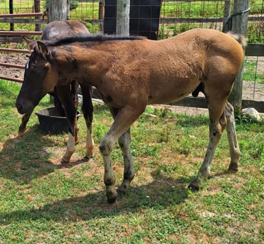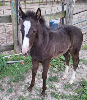 Whitney is a March 2025 filly. She's black or dark brown, with white socks in the back. She has a funky blaze that gives her character. Her personality is friendly and inquisitive, our socialite. Although Whitney has some pretty quick feet, she can be very quiet and unruffled about commotion. She looks like she'll be over 15 hands tall and have eye-catching looks with good solid conformation. Her sire is a money earning barrel racer, Seek Ta Fame. Her dam is a stout built ranch type mare that has several old time cutting horses on her papers like: High Brow Hickory, Smart Little Lena, Peppy San, and Freckles Playboy. Whitney is eligible for Ranching Heritage, Future Fortunes, Colorado Classic, and Iowa Ranch Horse Futurities. SOLD!